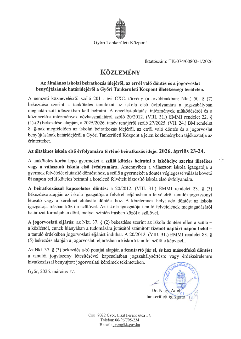 A 2026/2027. tanévre vonatkozó beiratkozással kapcsolatos közlemény A 2026/2027. tanévre vonatkozó beiratkozással kapcsolatos közlemény 2026-03-20 Süle Attila