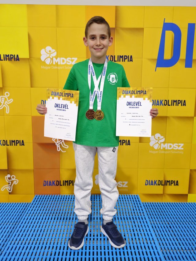 Nehiba Dominik, iskolánk 3.b osztályos tanulója az Úszó Diákolimpia Vármegyei Döntőjén 1. helyen végzett 50m mell és 50m hátúszásban az iskolát képviselve. Ezzel az eredménnyel ő lett Győr-Moson-Sopron Vármegye Úszó Diákolimpia Bajnoka ebben a két úszásnemben. Dominik a Budapesten megrendezésre kerülő Úszás Országos Diákolimpia döntőjében 50 m mellen Országos Bajnok, 50 m hátúszásban pedig országos 3. hely büszke tulajdonosa. Gratulálunk Dominiknek! Büszkék vagyunk nagyszerű eredményeire, és további sikereket kívánunk!