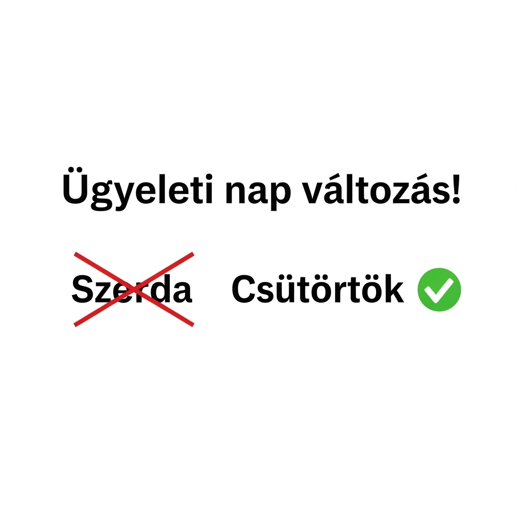 Ügyeleti nap változás Ügyeleti nap változás 2025-07-18 Süle Attila Tájékoztatjuk Önöket, hogy technikai okok miatt 2025. július 23. szerda helyett 2025.július 24.-én csütörtökön 08:00-12:00 lesz mód hivatali ügyintézésre